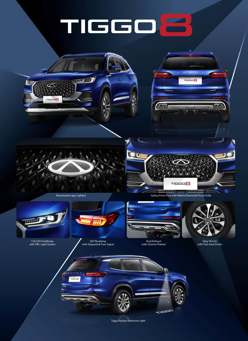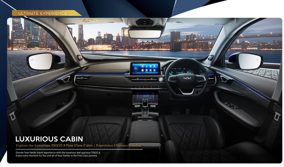 Tiap detail di desain dengan presisi untuk memancarkan aura modern, sporty dan futuristik. Berkendara Dengan Percaya Diri, Bersiaplah untuk memasuki dimensi penuh kemewahan dan teknologi canggih dalam kabin TIGGO 8.